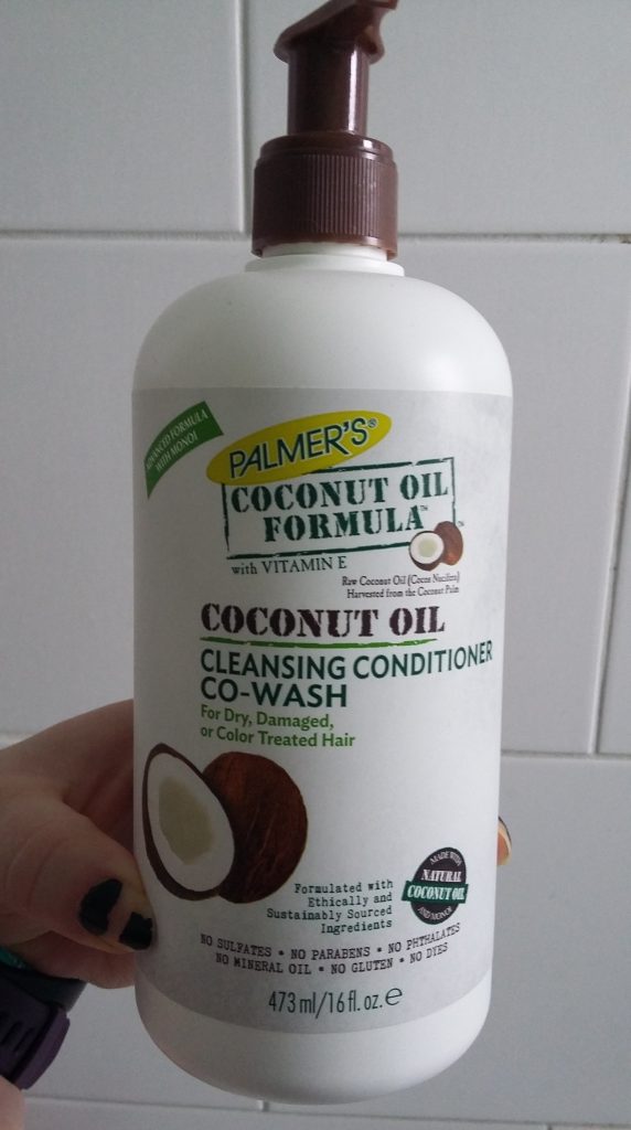 This stuff is worth buying for the smell alone! The product’s full name is Palmer’s Coconut Oil Formula, Coconut Oil Cleansing Conditioner Co-Wash. Not quite as bad as she sells seashells by the seashore but it’s getting there.