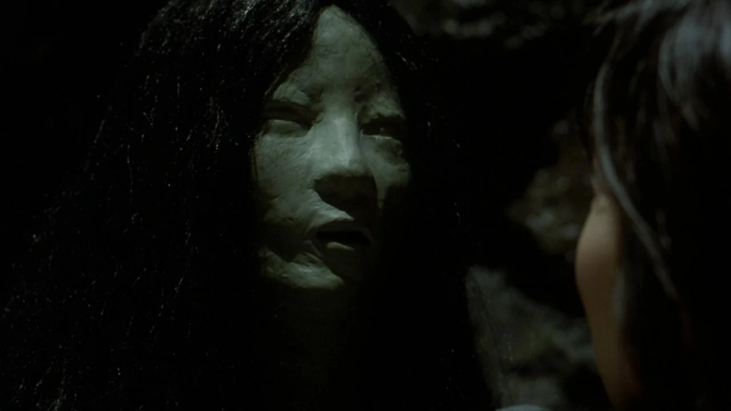 In Ringu 2, there is a scene in which Sadako pursues characters up the walls of her well. Her face is a prosthetic, resembling forensic facial reconstructions but also, to me, some Butoh makeup.