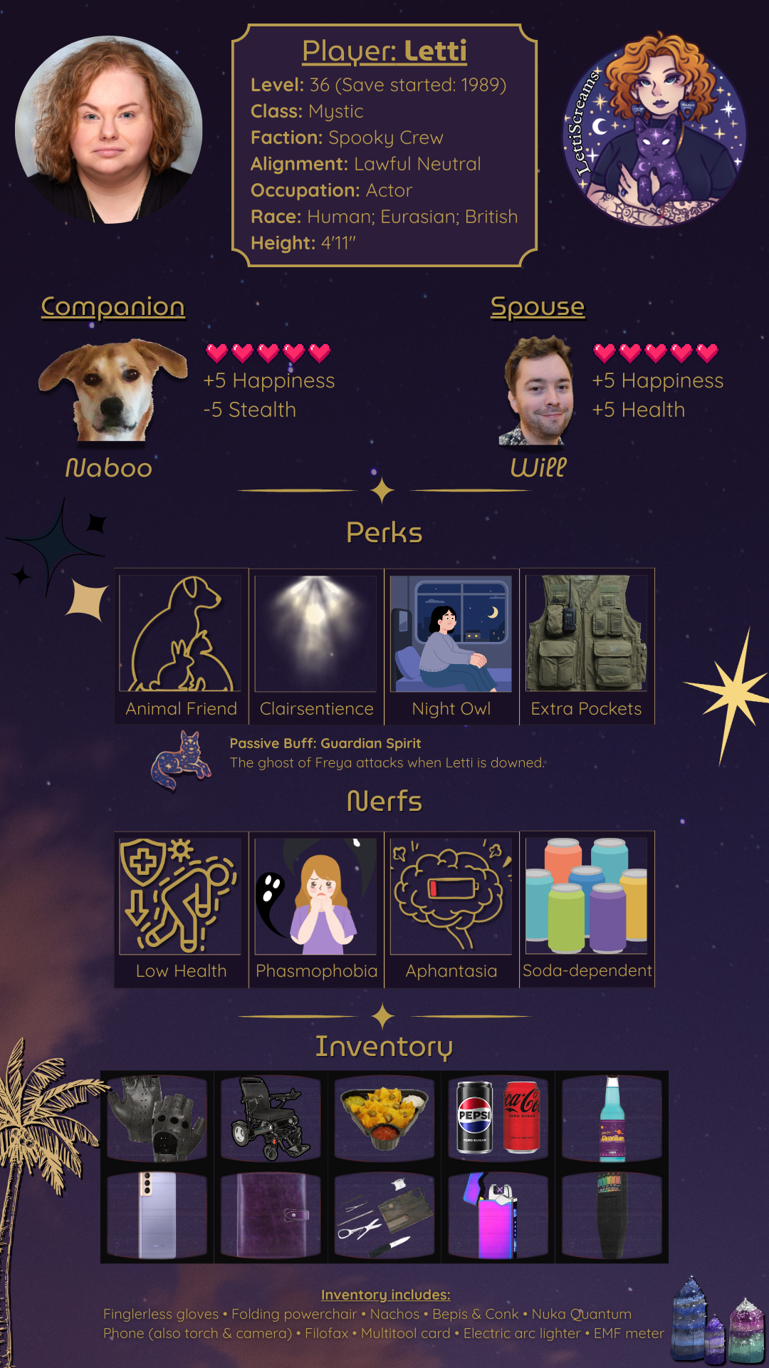 Yo, I’m Letti, an all-around entertainer and content creator balancing livestreaming, video editing, and acting. I specialise in horror, though almost always viewed through a humorous lens, and I like to get cosy with a fake farm or zoo, too. My head lives in Y2K but I love plenty of new games as well. Sagittarius sun, moon, and rising, INFJ, millennial age bracket. I live in the south of England with my husband. I’m really just here to vibe and have fun. Stay spooky y’all.